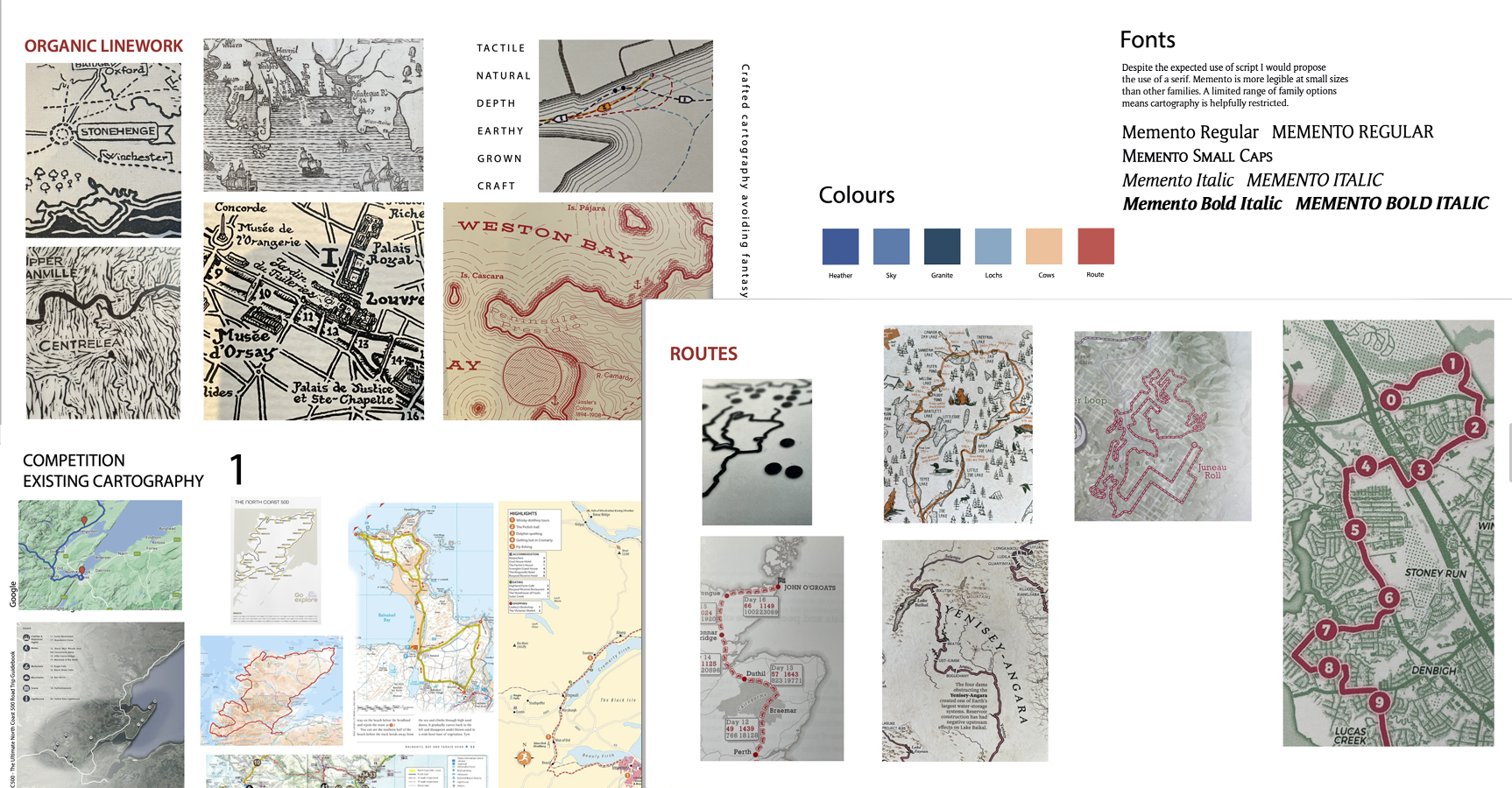 Approaching the title with the design team the early talk was of the earthy natural landscapes and curved natural lines immediately turning my thoughts to natural ways to show the route cartographically. The next step was to build a map moodboard to explain to the team where I was thinking of taking to maps. I was pulling together all manners of textures, creatures and imagery. I loved the idea of a carved, honest and natural representation of the route and had started to look at ways to produce this in the book at a sensible budget and technical manner.