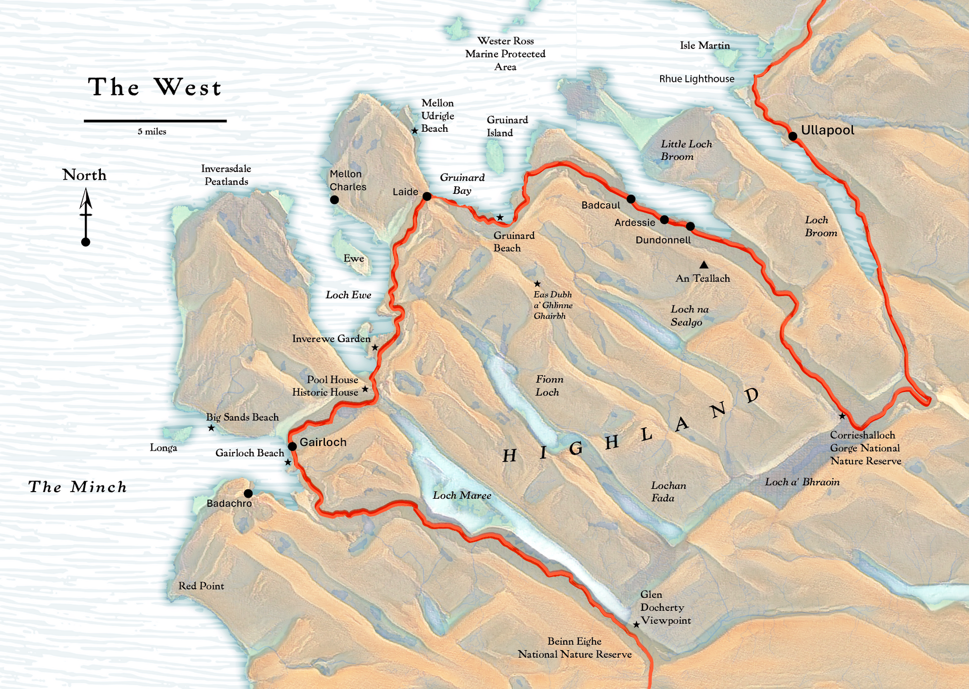 As a style we had been avoiding placing solid coastlines on maps for a while to soften the maps, the water colour is usually designed to be different enough to contrast and depict the oceans. In this book I wanted to bring the coastline back but also add a gradated echo of the coast with gaps to depict water movement. This was solely for tidal coastal areas meaning the lochs remained simply depicted.