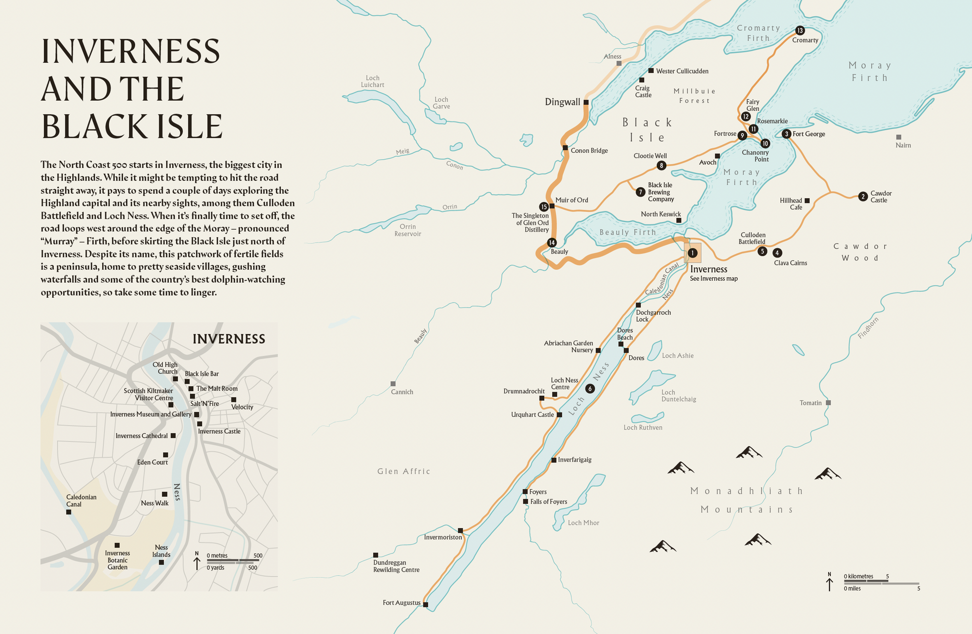 The start of the route featured a number of sights with the city of Inverness. Initially we had thought the city may be its own map separate to the route pages but this soon merged with the first few sights south of the Moray Firth and into the Black Isle. The shape and flow of the map ended up allowing a small inset map to show the centre of Inverness to be shown in the bottom left of the first full page map. This I chose not to frame as it would be too overpowering, instead I added a small percentage of black to the background tint to represent an urban area.