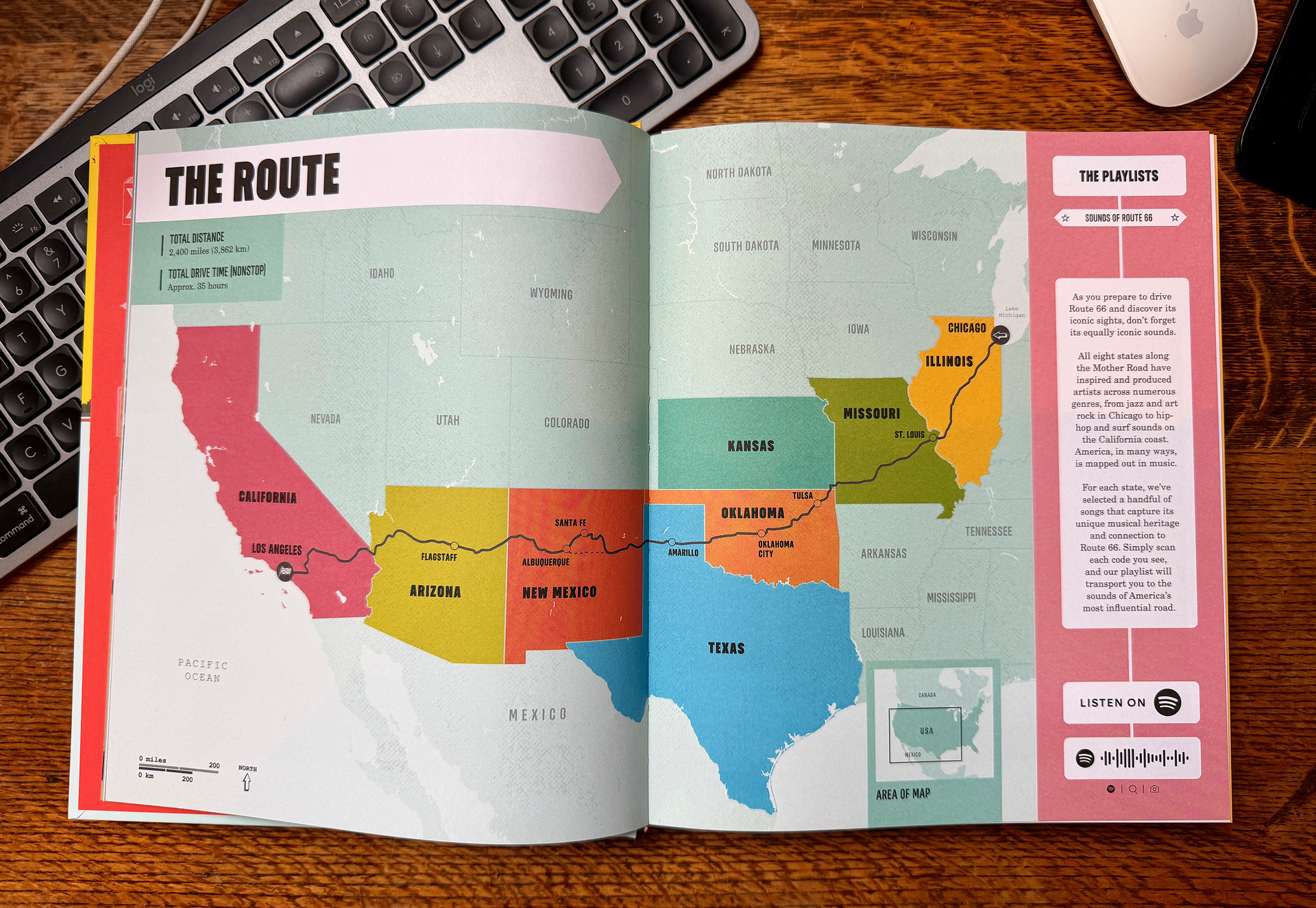 As we were not including the city maps we had a lot of space to fill. One suggestion was a secondary list of the slights along the route shown with a page reference to assist in cross referencing to the pages in the forthcoming chapter. What soon became apparent was the labels on the map were strong enough to include these page numbers and it was clearly just filling space. An idea late in the project was later brought into the page, the music playlist. This means the maps could shrink down a little to allow space.