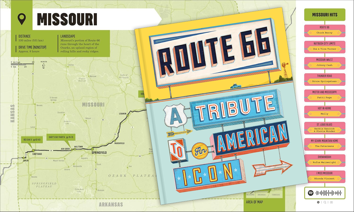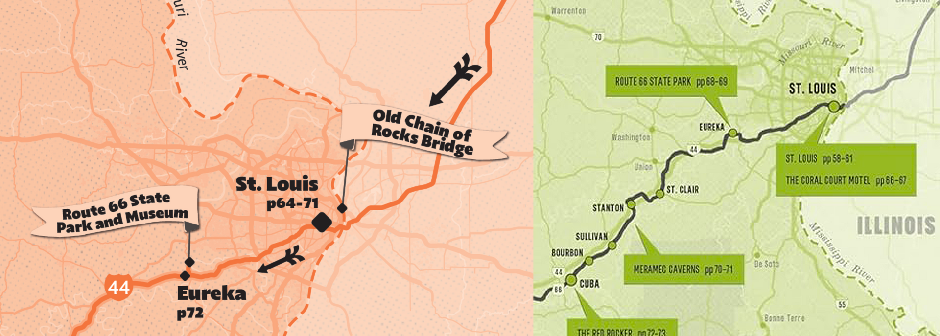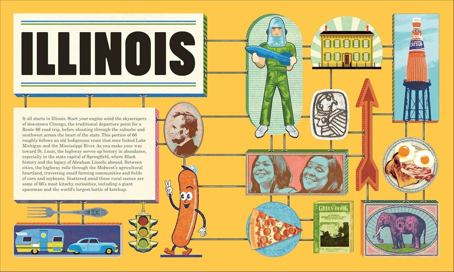 was an interesting anomaly within the book, the route only dips into the lower southeasten corner of the state for a few miles. This was a content limitation for the authors as well as cartography, how do you build a whole chapter around few entries. Thankfully there were enough interesting sights in the small segment of the route to fill a number of spreads, with a couple of large full page images it would not feel so restricted.