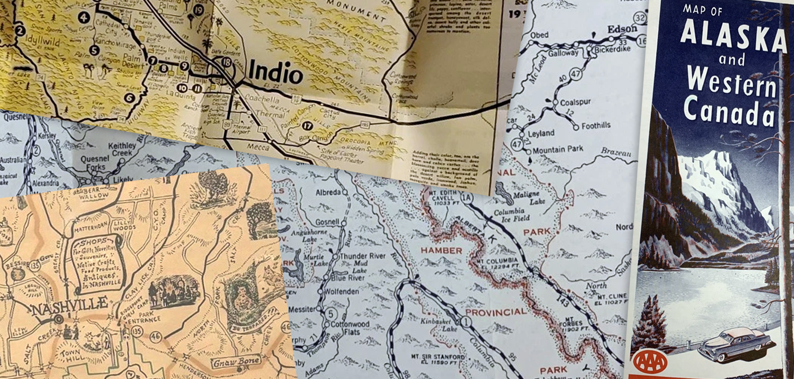 Thoughts of old AAA and Rand McNally sheet maps that would have been integral to any US road trip came immediately to mind, alongside the countless free promotional maps handed out at diners and hotels, all thumbed, annotated and road worn.