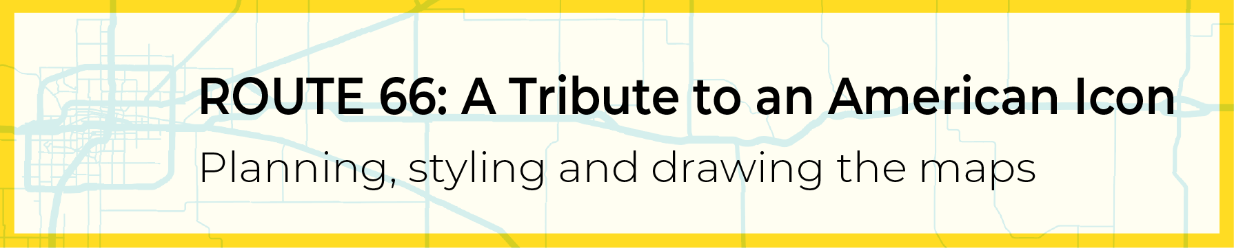 By this point it had been decided that the book was to be an inspirational overview of the route with each of the long, beautifully illustrated chapters dedicated to a different state as the reader progressed west. I would be allocated a page spread near the start of each chapter to show the shape of the route from the point it entered the state to when it left. This was the bulk of the cartographic work.