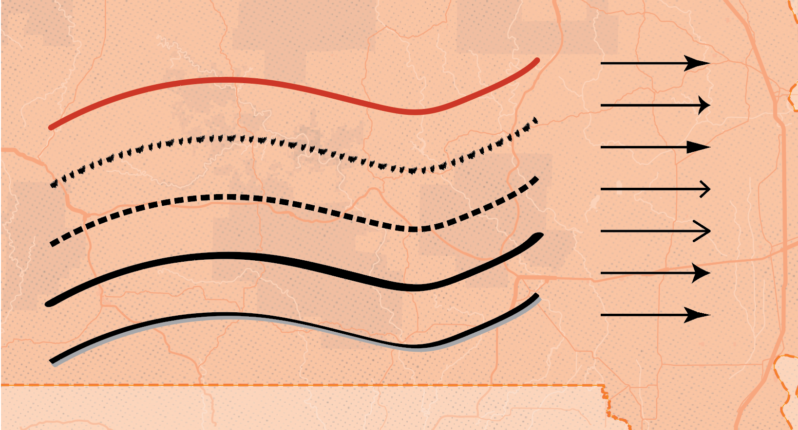 The line of the route itself was also given a distorted texture, it was too solid and imposing on its own as a wide black line so a duotone style was added. To do this the line was converted from a single stroke to a filled polygon into which textures could be added.