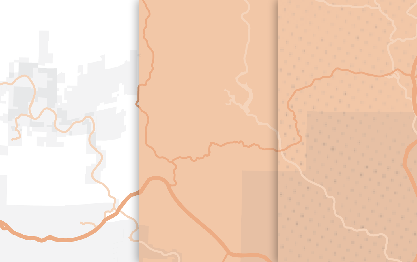 I had originally overlayed a temporary dotted and distressed texture which filled empty space on the map and called back to the printed texture of old mass market free sheets.